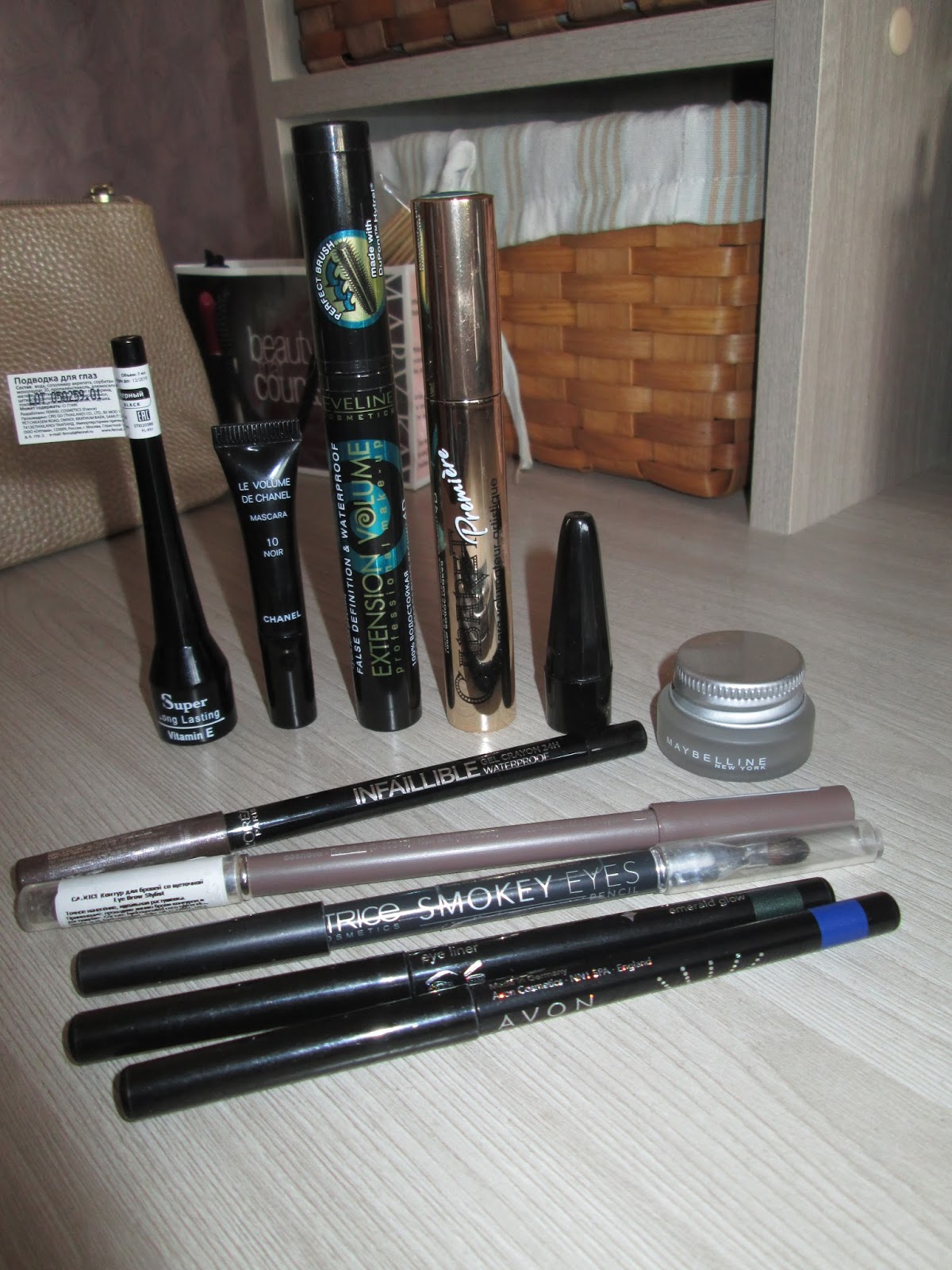 Для глаз всё будет пока стандартно - подводка Fennel почти засохла, тушь Chanel пока красит, тушь Eveline водостойкая, пока не закончится зима и снегопады (а у нас сегодня за окном -15). Тушь зеленая Vivienne Sabo красиво смотрится на нижних ресницах. Каял индийский лежит всегда в косметичке, подводка Maybelline - мне не нравится, но надо хоть как-то её использовать. Из того, что еще хочу закончить - это карандаши Avon зеленый и синий.